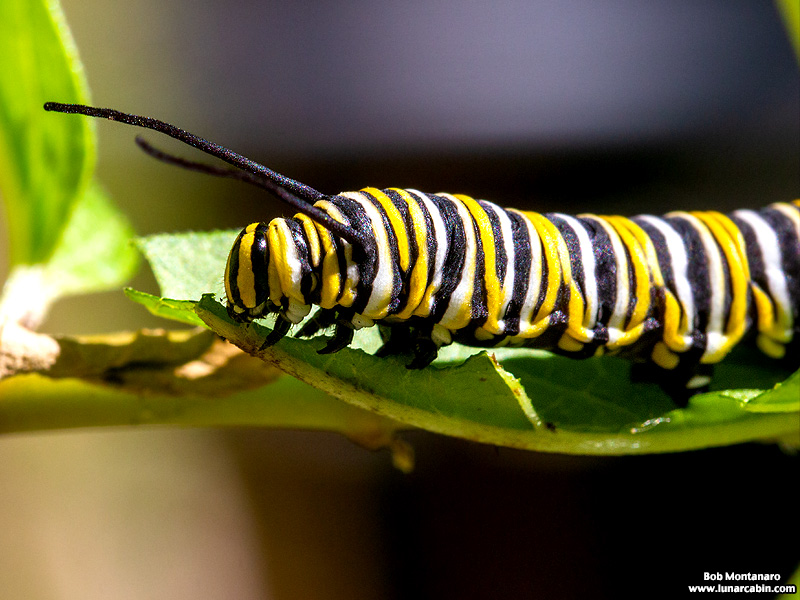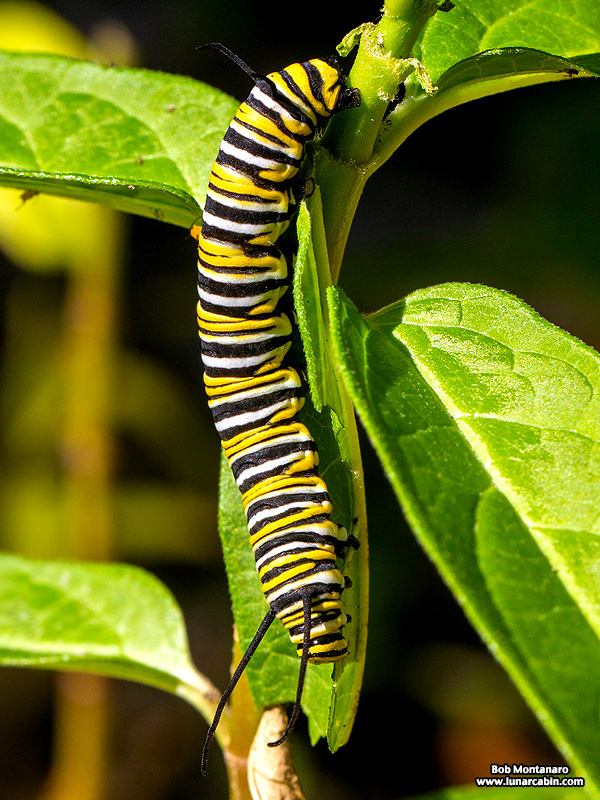 A big, fat caterpillar eats its way through the milkweed as it builds strength for the metamorphosis to a Monarch butterfly.