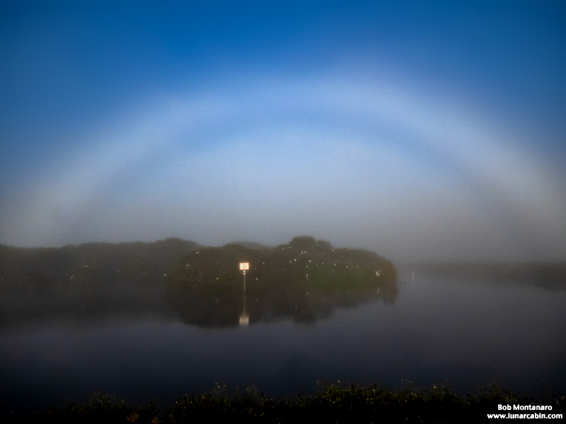 A fogbow appears opposite the rising Sun at the Stick Marsh Critical Wildlife Area. The white objects on the islands are just some of the many birds that call the island home.