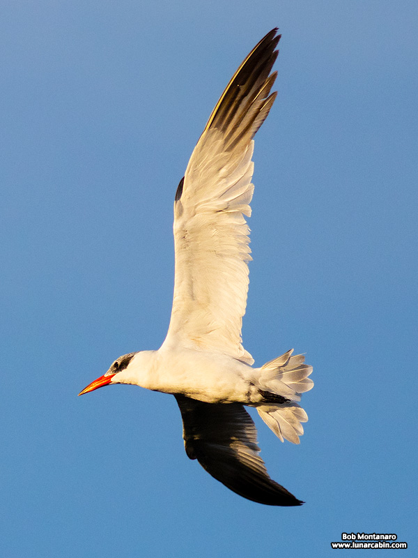 The long-winged Caspian Tern hunting for fish over the fast flowing waters of the Sebastian Inlet channel.