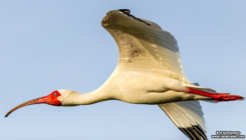 A White Ibis, its face and legs a brilliant red denoting its in the midst of breeding season, wings its way over the Stick Marsh.