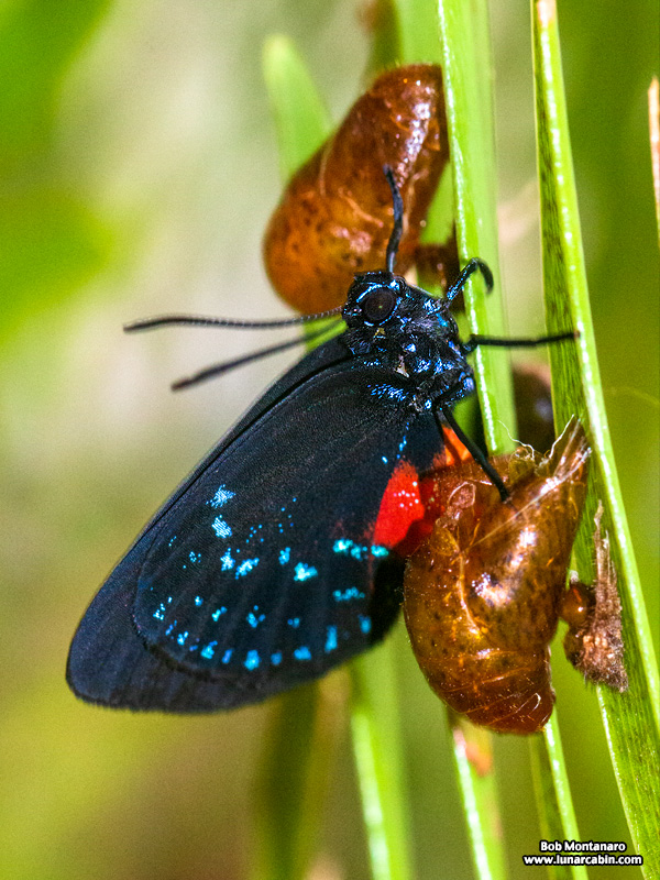 A newly emerged Atala butterfly by the husk of its chrysalis. The Atala is waiting for its once compacted wings to firm up to support flight.
