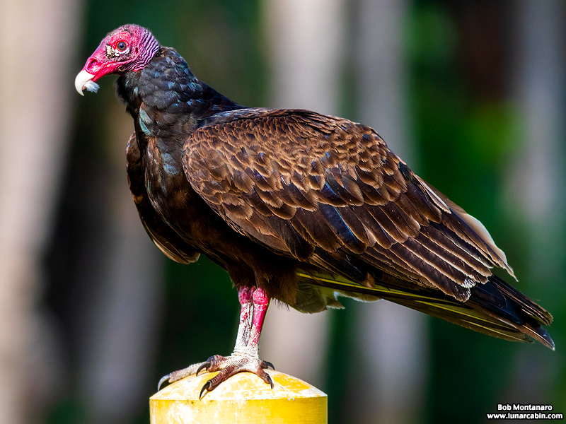 A Turkey Vulture takes a break from preening with one of its own feathers unintentionally left over in its beak.