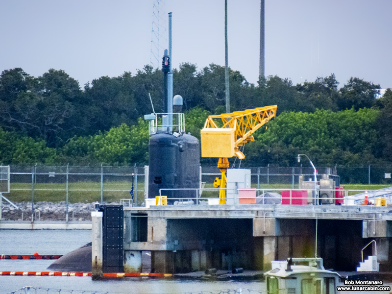 A submarine looks to be doing its best not to be seen tied up at the dock in the U.S. Navy basin at Port Canaveral, which is a long way from the comforting secrecy of the ocean depths.