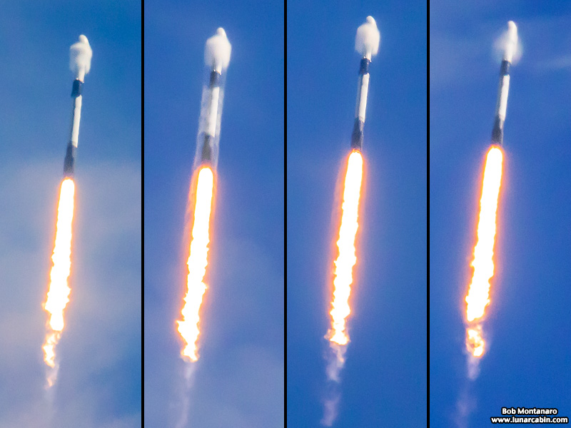 Water vapor condenses around a SpaceX Falcon 9 rocket from the shockwave produced by breaking the sound barrier as the rocket launches the eleventh Starlink mission on 18 August 2020 at 10:31 a.m. from Space Launch Complex 40 (SLC-40) at Cape Canaveral Air Force Station. The rocket boosted 58 Starlink satellites and three Earth observation Skysats (19-21) for Planet. This is the sixth flight for this particular Falcon 9 first stage – a milestone achievement in reusability.