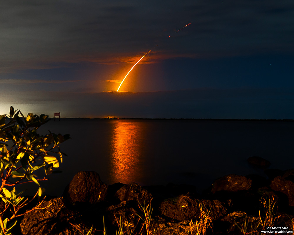 A SpaceX Falcon 9 rocket launched its sixteenth Starlink mission carrying 60 Starlink satellites into orbit from Space Launch Complex 40 (SLC-40) at Cape Canaveral Air Force Station at 9:13 p.m. on 24 November 2020 as seen in this time exposure looking northward over the Indian River Lagoon from the Wabasso Causeway.