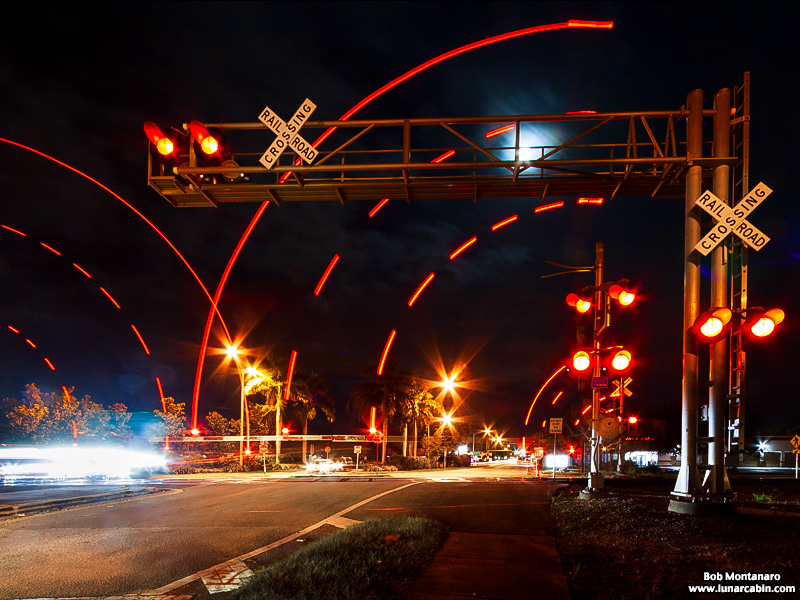 The sweep of the Florida East Coast Railway crossing gates festooned with blinking red lights create arcs as they raise back up to let traffic through after a train passes. This is all part of the railroad crossing automatic warning devices at the intersection of 21st Street and US-1 in downtown Vero Beach. And that is the Moon caught up in the girders of the cantilever railroad crossing structure.