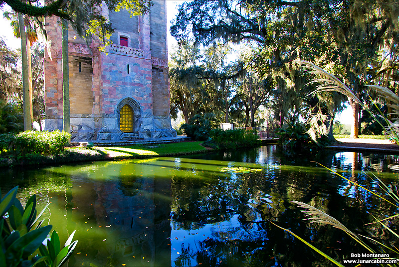 A Koi-filled moat surrounds the gold-doored Bok Tower.
