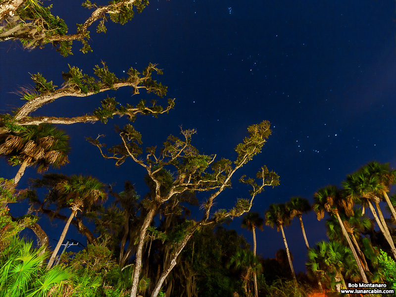 The constellation of Orion, the distinctive three stars making up its belt can be clearly seen, rising just above the palm trees and to the right of the oak trees in this early evening image taken at the Oslo Riverfront Conservation Area from the Audubon House parking lot. The Pleiades open star cluster in the constellation of Taurus is visible at the top center of the image as a tight clump of stars.
