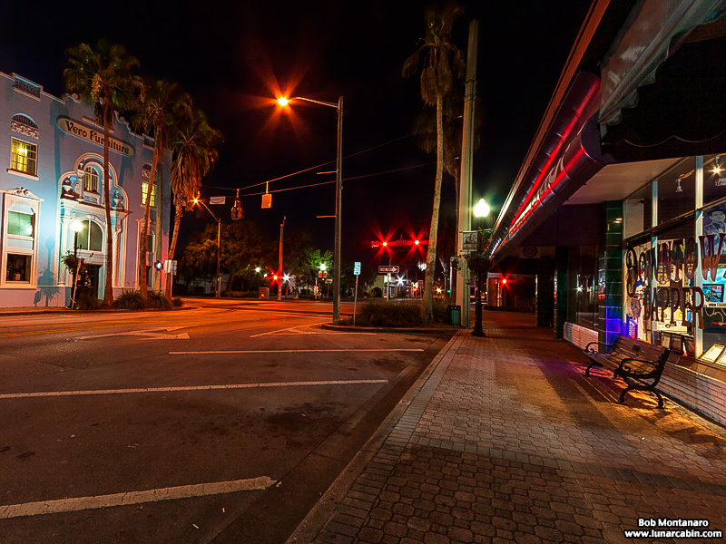 A reverse angle sidewalk view from yesterday’s Tunnel Vision post showing the old Citrus Bank turned Vero Furniture building with its American Beaux Art facade in early morning downtown Vero Beach.