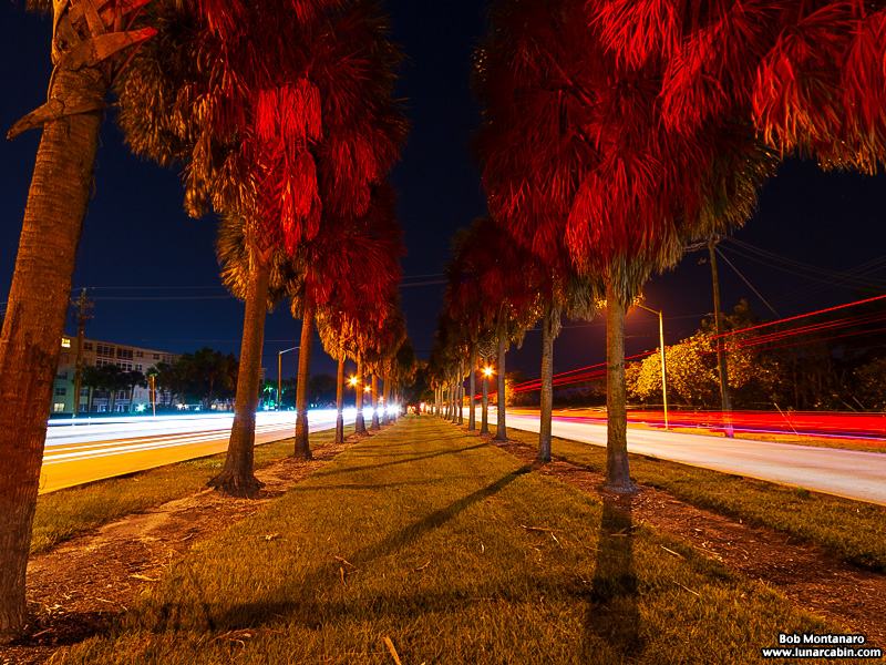 Cars streak by palm trees planted in the median on Indian River Boulevard in Vero Beach.