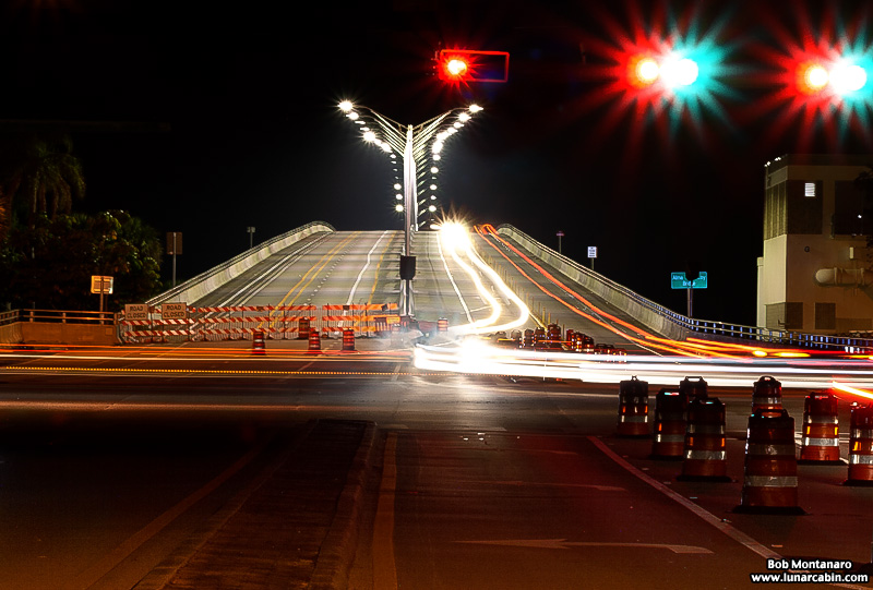 Cars streak by and over the 17th Street Bridge spanning the Indian River Lagoon in Vero Beach, which is having serious structural problems repaired caused by its age (constructed 1977-1979) and exposure to the elements. The tall building at right is part of the sewage treatment plant located next to the bridge.