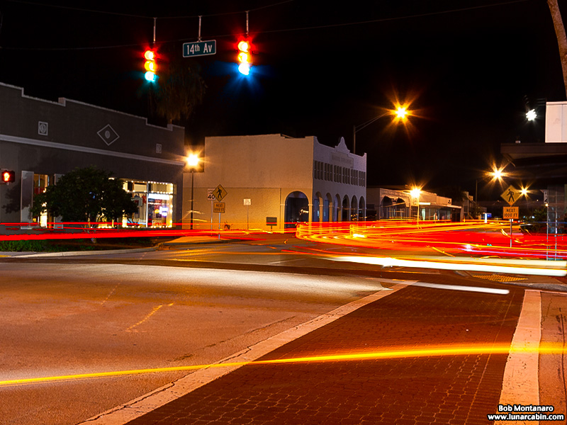 Automobiles trace streaks of motion at the intersection of 14th Avenue and Route 60 in downtown Vero Beach.