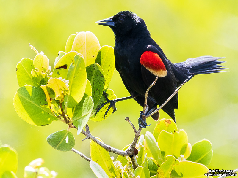 A male Red-winged Blackbird out and about on a hot morning at Merritt Island National Wildlife Refuge. He seemed to be busy defending a territory within which a female Red-winged Blackbird fluttered about.