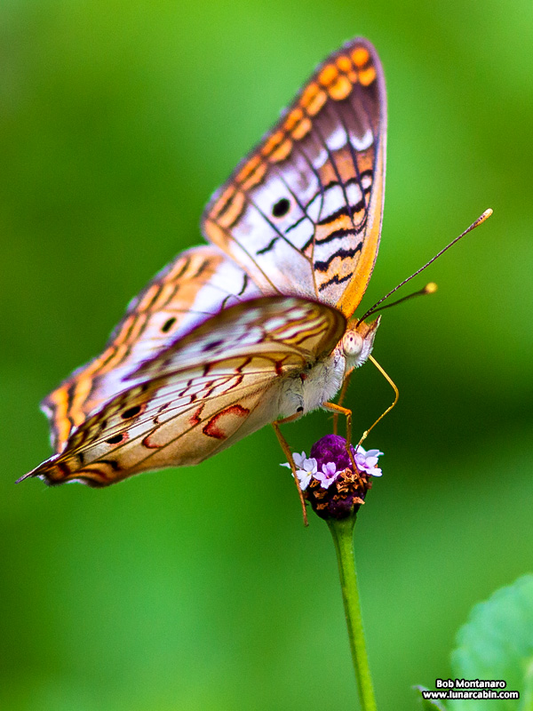 A White Peacock butterfly uses its proboscis to sip up nectar from a Frogfruit flower in the Audubon House landscaping.