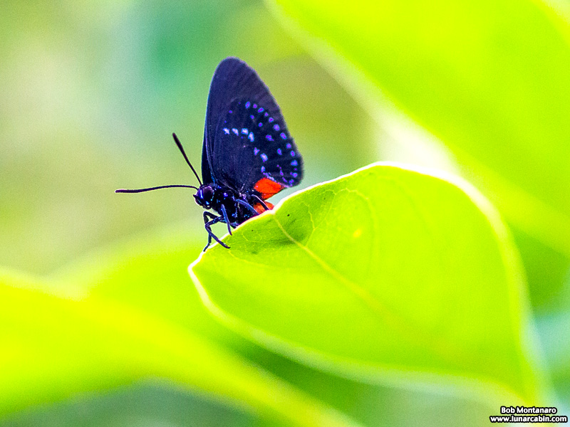 A commanding view for an Atala butterfly perched on the end of a leaf in the Audubon House landscaping.