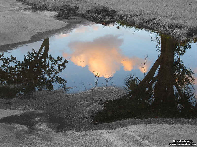 A random puddle in downtown Vero Beach encountered during Lucy’s canine walk reflects the sky during sunset.