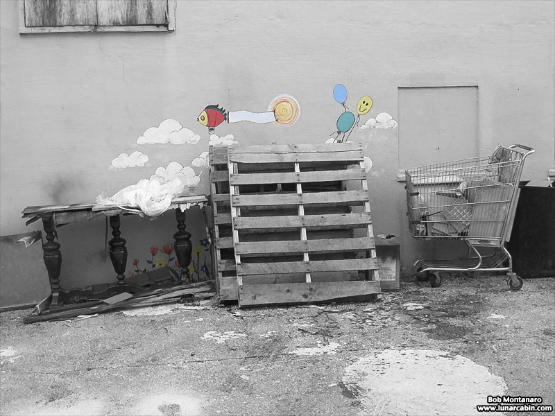 This garbage strewn alleyway in downtown Vero Beach looks like it was a happier place at one time based on the partially obscured wall mural. Lucy the canine and I took it in stride as we meandered along during our usual sunset walk.