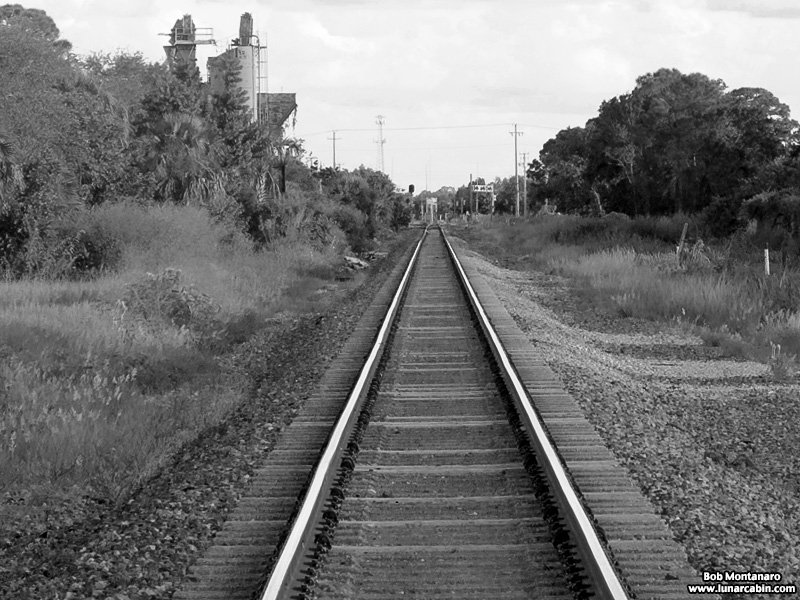 Lucy the canine and I cross the railroad tracks at least twice at various points in our sunset walks through downtown Vero Beach. The old cement factory can be seen above the trees at upper left.