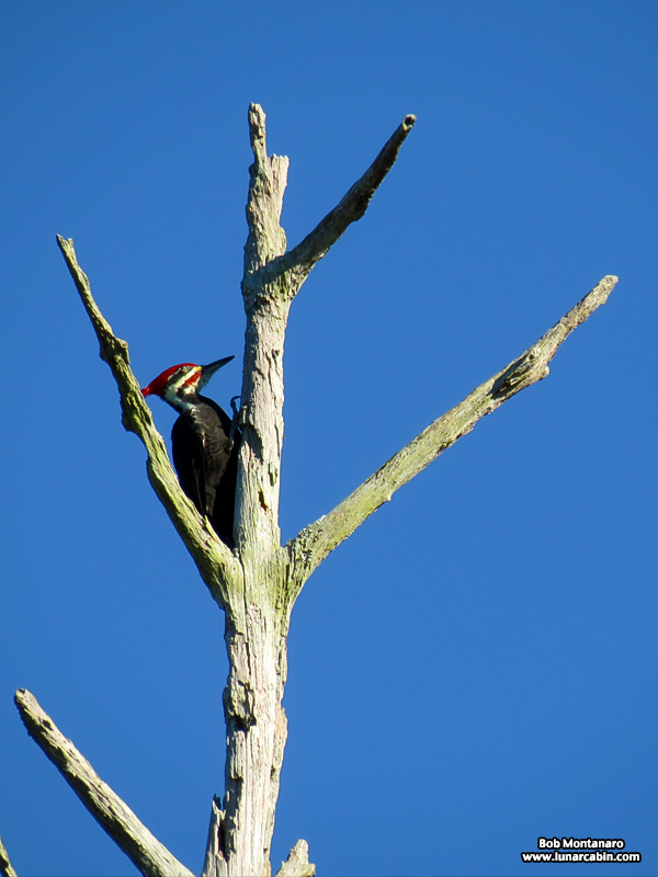 A male Pileated Woodpecker shyly greets the dawn while perched in the dead tree across from Audubon House at the Oslo Riverfront Conservation Area