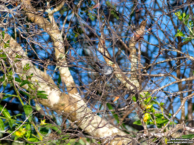 A Blue-gray Gnatcatcher forages for insects in a tree at the Stick Marsh. The tiny bird is about dead center in the image.