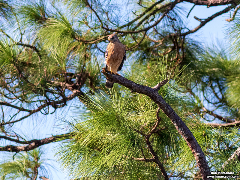 A Red-shouldered Hawk keeps an eye out for prey from a pine tree along the very long and bumpy Fellsmere Grade [dirt] Road heading out to the Stick Marsh.