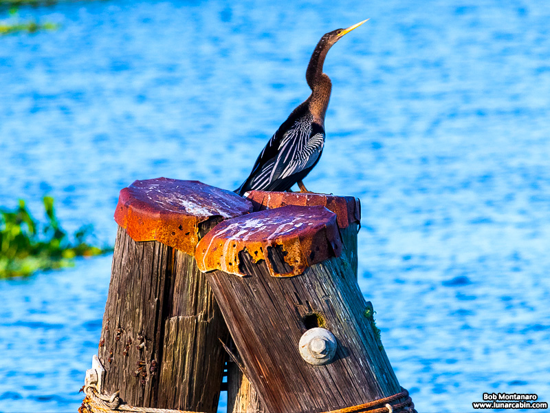 An Anhinga, also known as a Snake Bird due to its snake-like neck, on a piling at the Stick Marsh. A fast underwater swimmer, it uses its sharp bill to spear fish and bring them to the surface to be eaten.