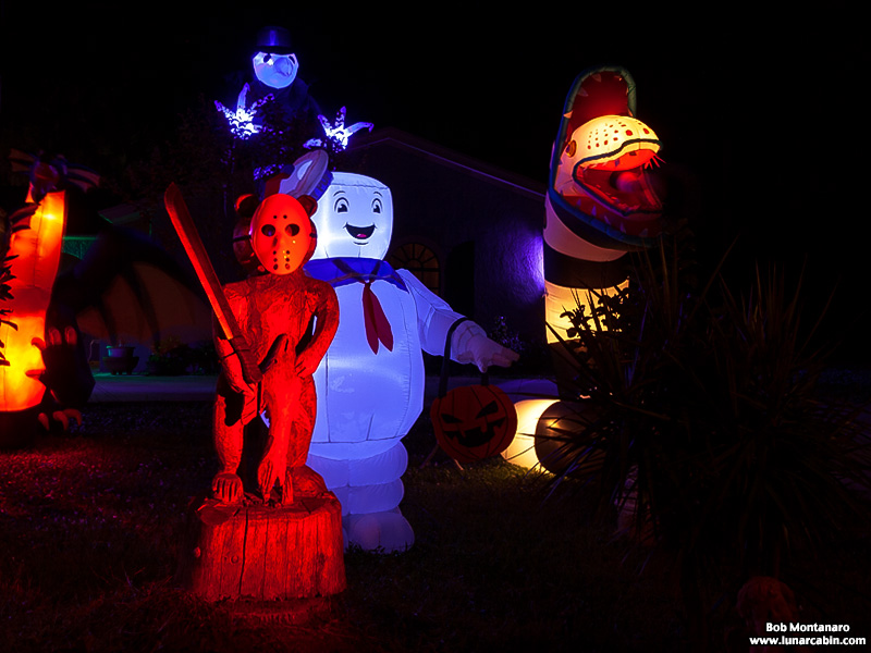 A cute carving of a bear cub holding a fish becomes a symbol of menace when outfitting with a mask and a plastic machete in my brother’s tableau of Halloween horrors.