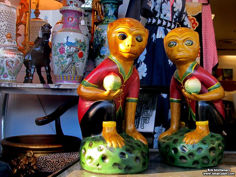 A couple of fun objects seen in a window display of vintage goods in downtown Vero Beach. Not sure what they are doing or why they are dressed the way they are, and, most importantly, what are they holding?