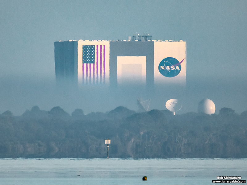 The Vehicle Assembly Building (VAB) at Kennedy Space Center rises up out of a ground-hugging fog at sunrise. The VAB, built for the final assembly of the massive Saturn V moon rocket for the Apollo program and the subsequent Space Shuttle Program, now houses the massive Space Launch System rocket for the Artemis program to return to the Moon and beyond.