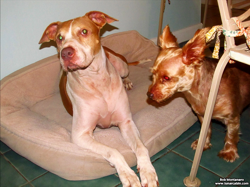 Lucy looks a bit pained at being disturbed by Little Joey. The flash lights up the tapetum lucidum in their eyes revealing a pleasant green color in Lucy and an appropriate devilish red in Joey.