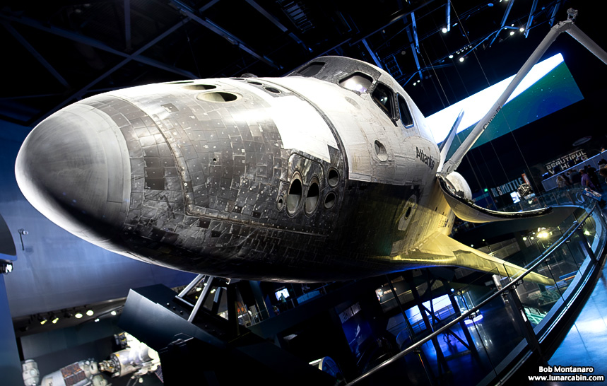 Lots of panoramic distortion in this image, especially in the nose and tail section. The decision to display Atlantis as it would appear in space, with its cargo bay doors open, was an inspired choice.