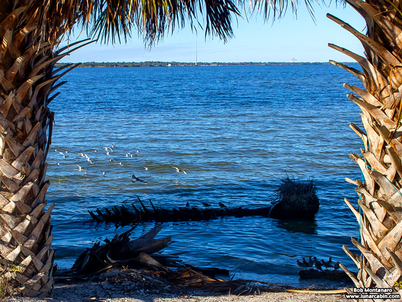 Sanderlings fly in to roost on a fallen palm in the waters of the Banana River. Note the birds congregated in the bottom right foreground. Along the horizon the massive bulk of the Vehicle Assembly Building at Kennedy Space Center looms above the distant tree line.