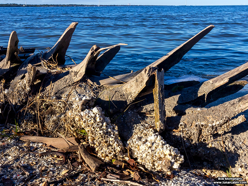 A fallen, barnacle-covered palm tree trunk looks like a dinosaur skeleton along the banks of the Banana River.