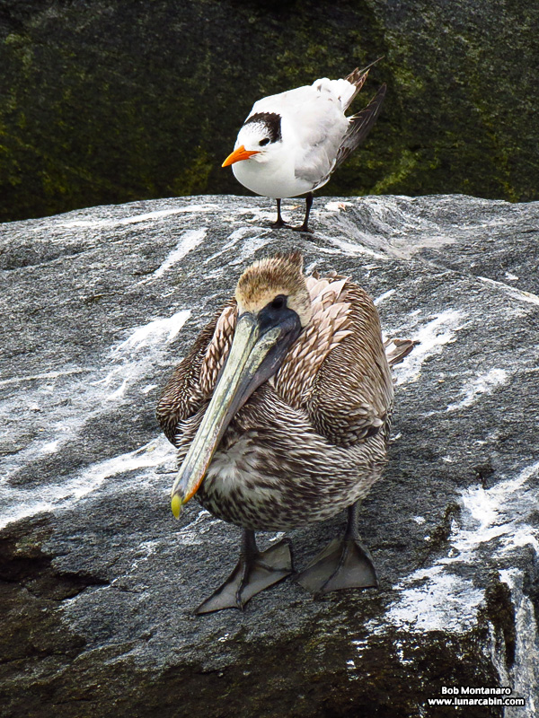 A Brown Pelican and a Royal Tern on the rocks in Jetty Park at Port Canaveral. The rocks line the channel at the entrance to the Port and are a good spot to see birds, even on a cold winter day in Florida like this one.