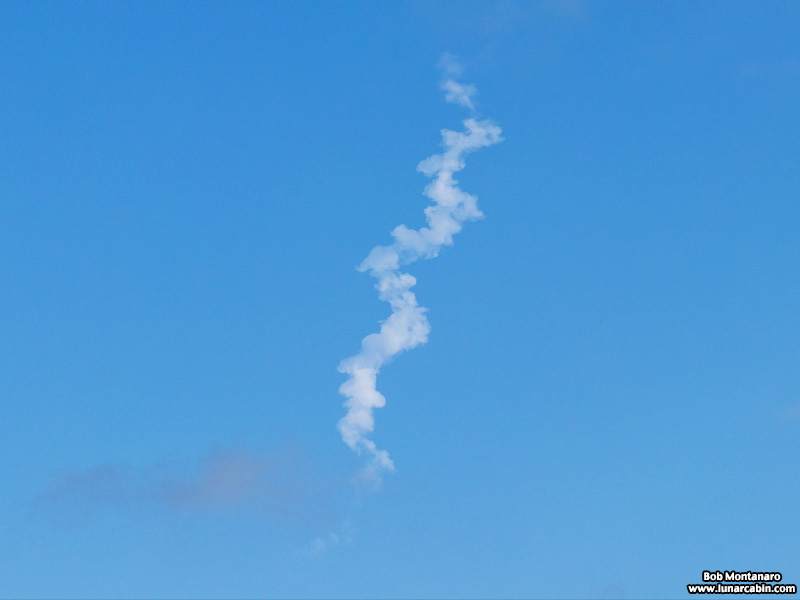 A small break in the clouds reveals the nebulous exhaust plume marking the passage of the Starlink 4-10 Falcon 9’s flight to orbit in this long distance view from Riverside Park in Vero Beach.