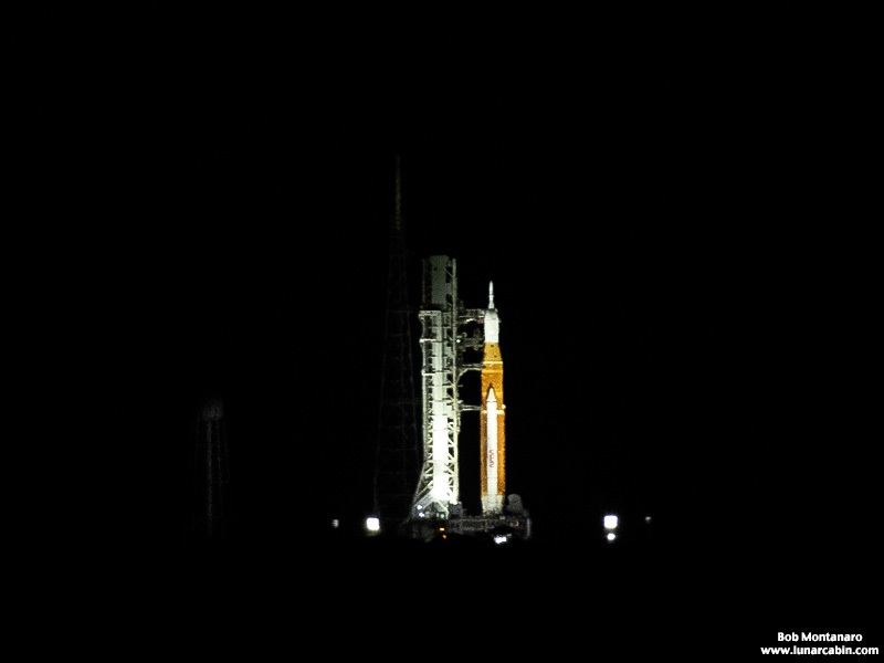 A long distance view from the top of the Max Brewer Bridge in Titusville of the Artemis 1 / Space Launch System (SLS) rocket poised for fueling tests on Launch Complex 39B at Kennedy Space Center. During the Wet Dress Rehearsal (WDR), a full-up fueling test and simulated countdown ending just before ignition, the SLS will be put through its paces. After the WDR, the SLS will be moved back to the Vehicle Assembly Building for final checkouts before returning to the launch pad for its first flight to send an uncrewed Orion spacecraft looping around the Moon and back to Earth. Its second launch will see the flight repeated with a crew of four astronauts aboard.