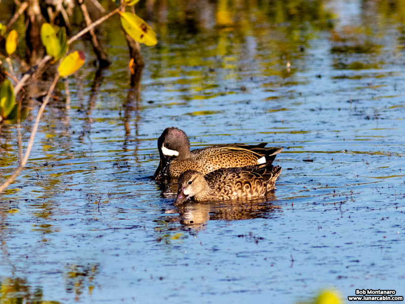 A male, background, and female Blue-winged Teal foraging at Merritt Island National Wildlife Refuge.