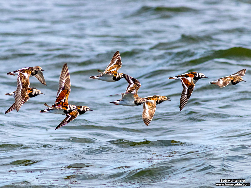 A flock of Ruddy Turnstones moving fast while caught in the high winds blowing over the Banana River.