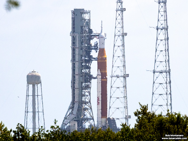 The massive Artemis 1 Space Launch System (SLS) rocket shimmers in the Florida heat in this view from the Apollo-Saturn V Center at Kennedy Space Center while waiting for the launch of Starlink 4-19.