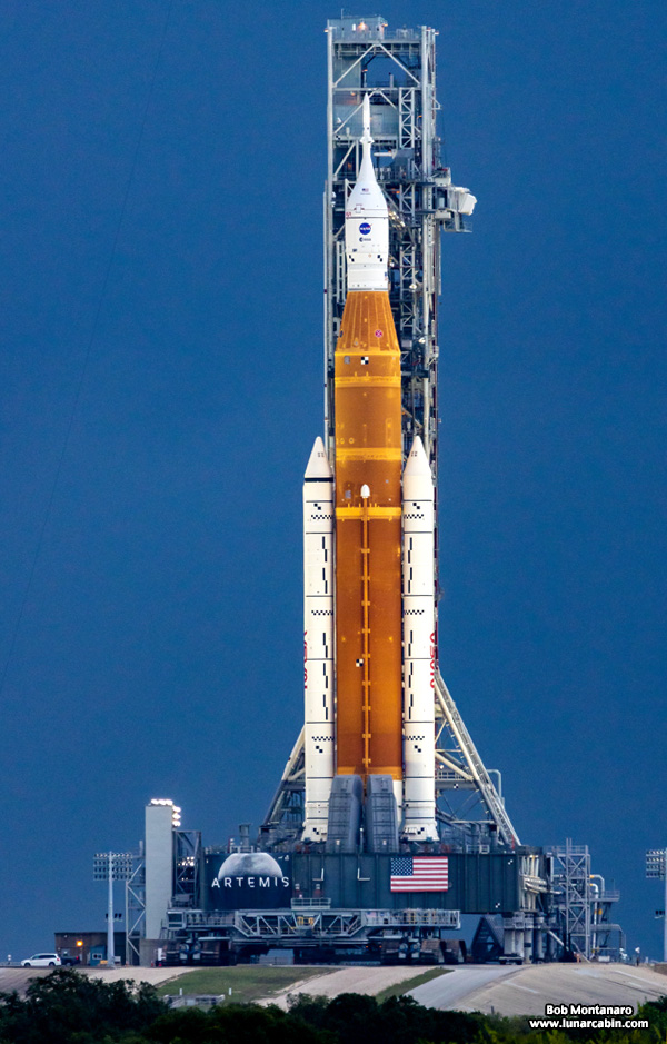 The rocket was being prepared to be moved back to the Vehicle Assembly Building for final checkouts. The Crawler-Transporter can be seen parked at the base of the SLS prior to moving beneath the Mobile Launcher, picking it up, and moving it all back to the VAB.