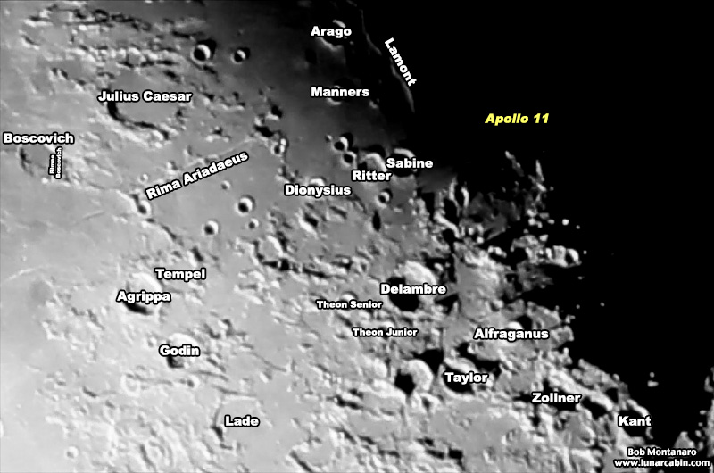 Some of the more prominent features are labeled in this image, including the approximate Apollo 11 landing site shrouded in darkness.