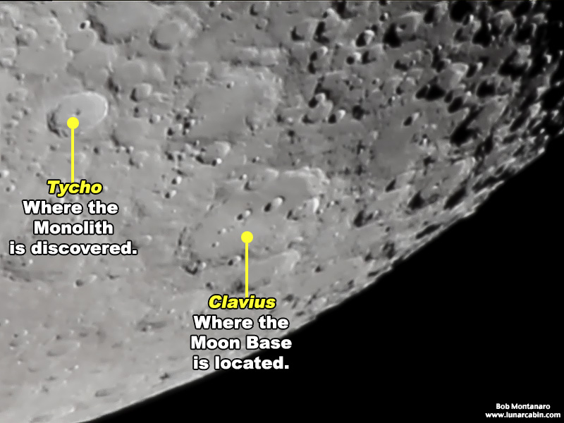 The giant crater Clavius was home to the large Moon Base while the crater Tycho was where the mysterious black monolith was found.