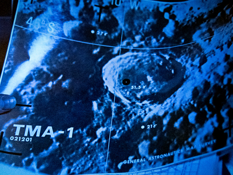 Later, onboard the Moon Bus flying to Tycho crater, the astronauts eat sandwiches and look at what drew them to finding the Monolith. Here they examine a photograph showing Tycho marked with the discovery site.