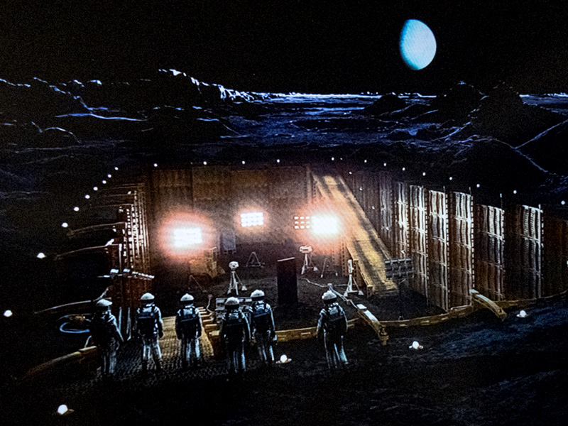 Some images from the film gathered by simply taking snapshots of the TV screen. Very high tech. The image above shows three astronauts on a ridge overlooking the Moon Base in the crater Clavius while the Earth-Moon shuttle descends for a landing.