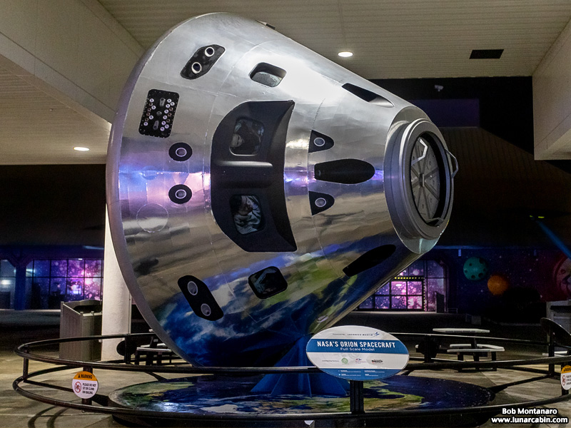 A mockup of the Orion spacecraft that will one day take astronauts back to the Moon as seen in the early morning hours while waiting for the launch of Artemis 1. Artemis 1 will carry an uncrewed version to test its systems on a 42-day flight to the Moon before it carries astronauts on the next flight. The mockup is at the Kennedy Space Center Visitor Complex and revolves so people can view all its sides without having to move. Lockheed Martin is the prime contractor for the spacecraft.