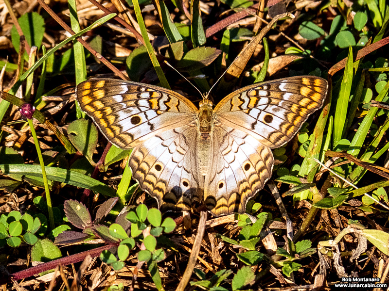 A White Peacock butterfly warms itself in the early morning Sun in the grass along the roadside in the Oslo Riverfront Conservation Area.