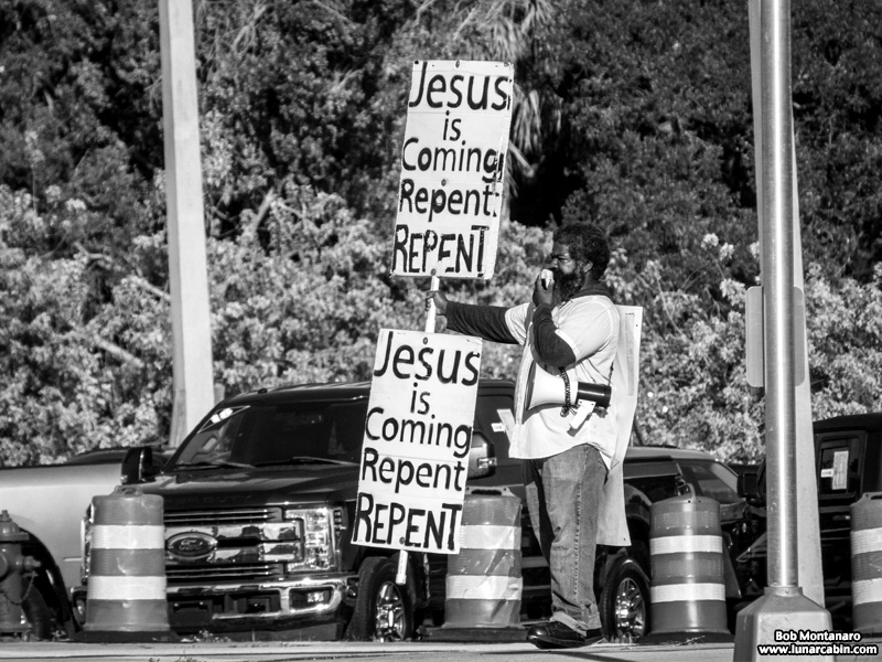 This roadside preacher is a familiar sight delivering fire & brimstone sermons at busy intersections around town.