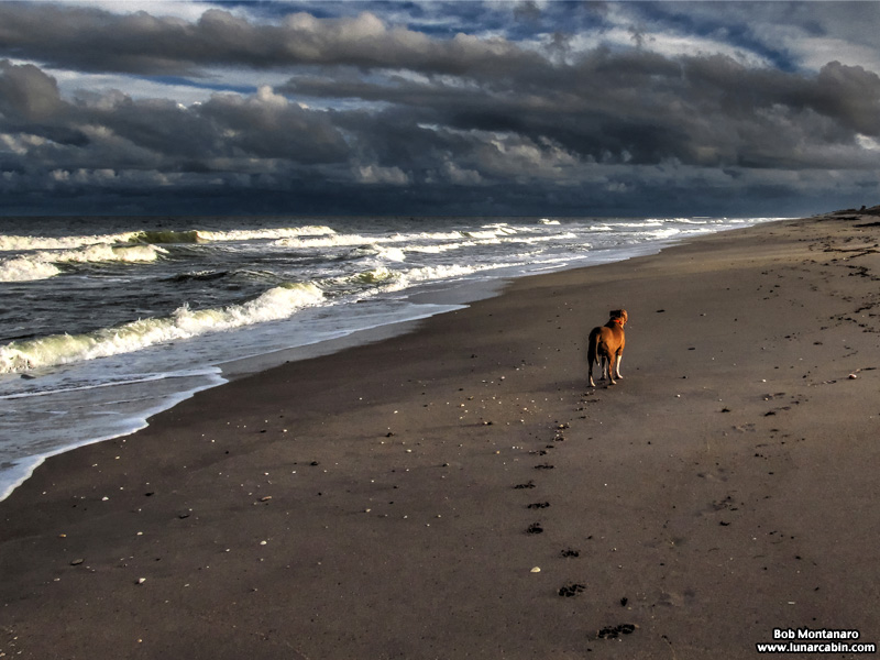 Sam braves the beach for a short visit between winter squalls that are bringing lots of rain to Indian River County, Florida.