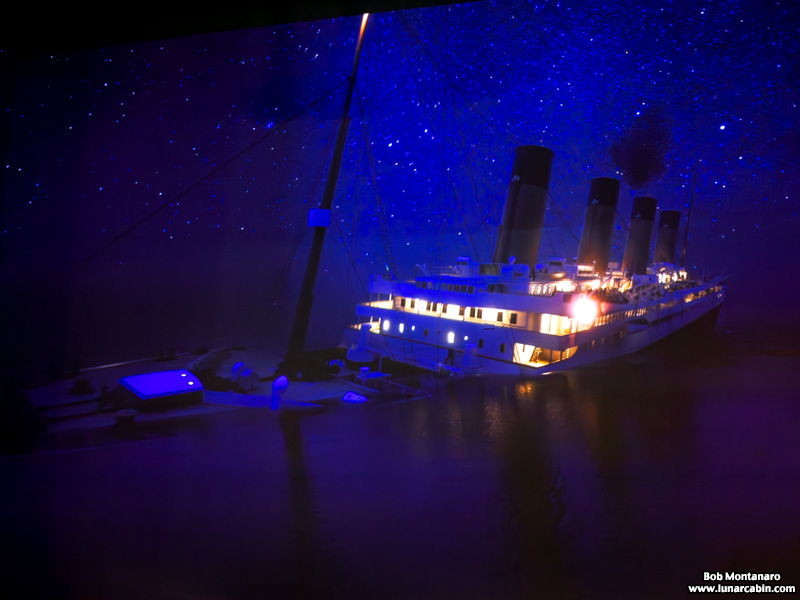 A theater with a 180-degree projection provides a CGI-rendered tour of the ship ending with the “unsinkable” ship striking the iceberg and sinking. The amazingly calm sea and starlit sky reported by the survivors is well rendered as seen here with the ship slowly sinking bow first.