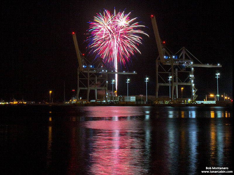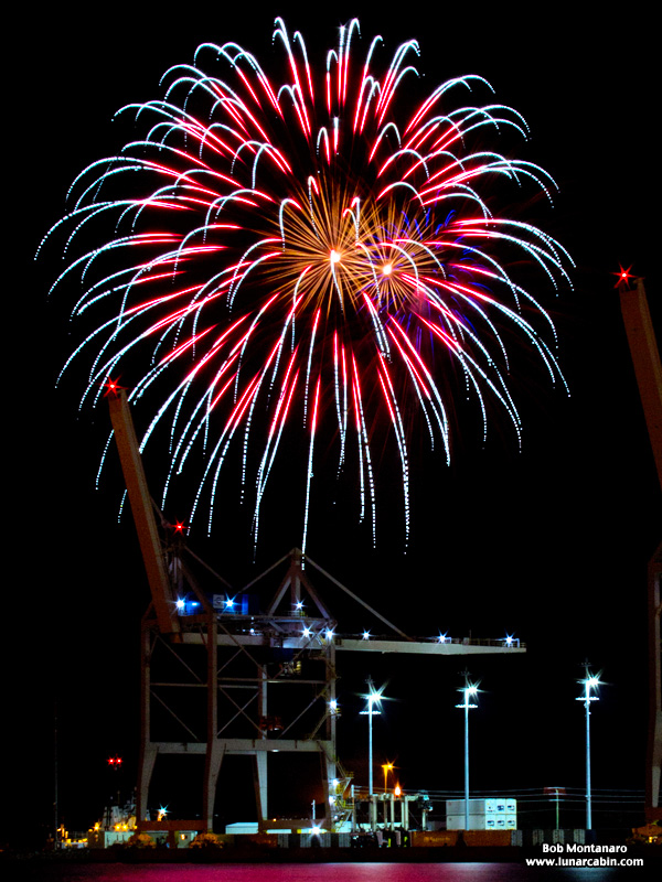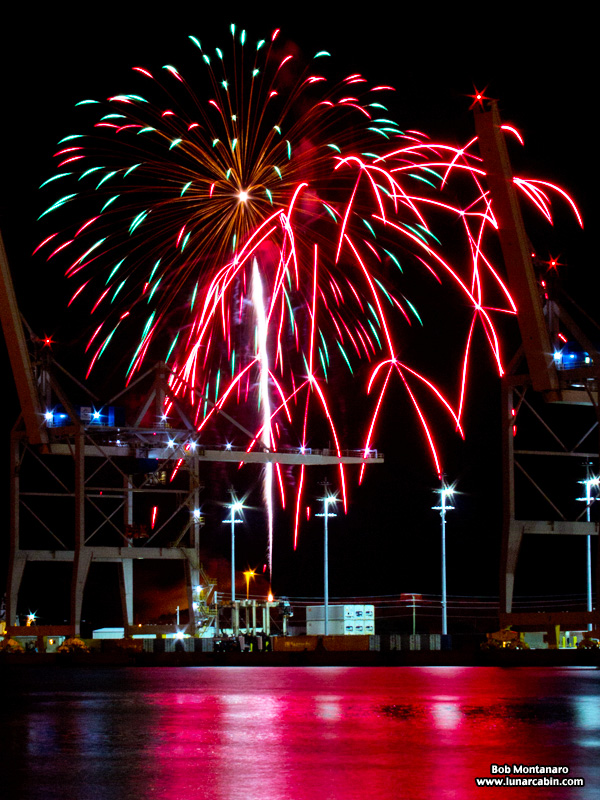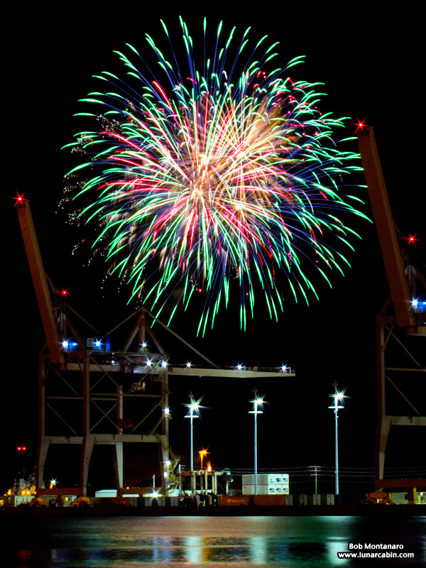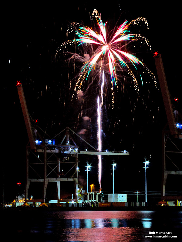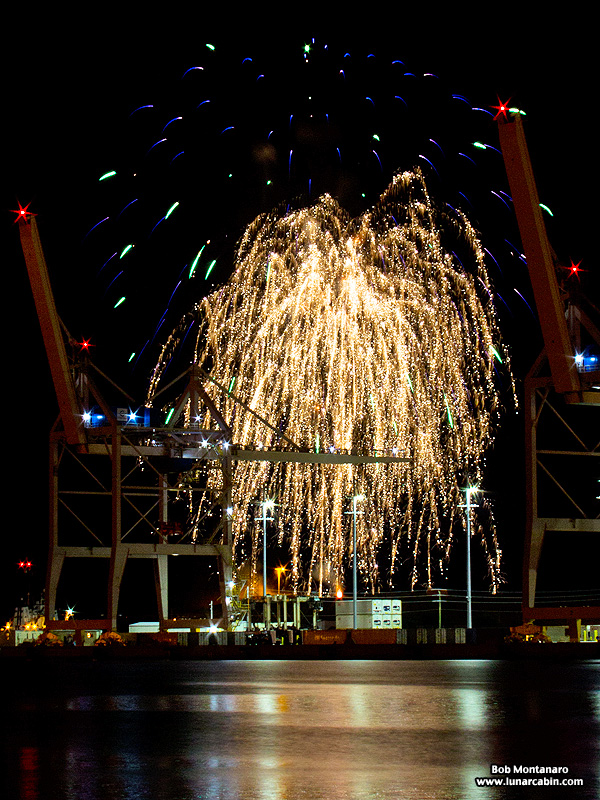 The fireworks display began around 9:40 p.m. and had a bit of an industrial flair with the cargo cranes in the foreground.